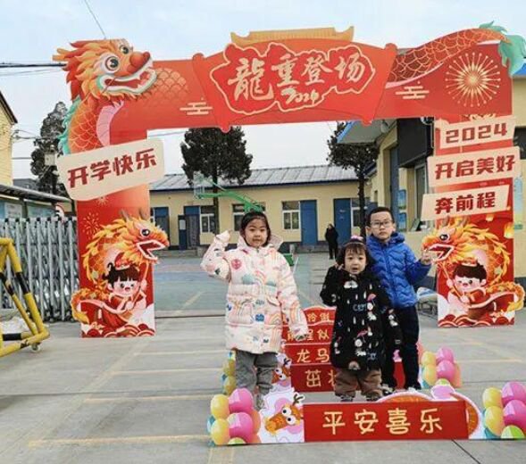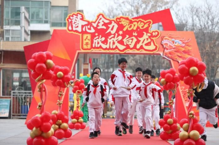 小学一派欢天喜地,教师们在学生通往教室的必经之路上,铺上了一条长长的红地毯,上面摆设了一条条写着“龙年大吉”“龙翔凤舞”“龙马精力”等大字的“龙门”,形象共同且充满创意。学生们经过此处时,纷纷抬脚跨过喜庆的“龙门”,寄望新学期学业有成。