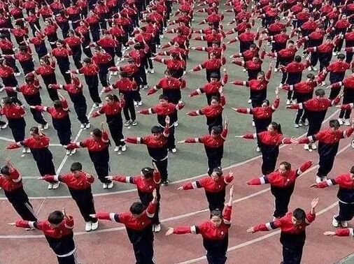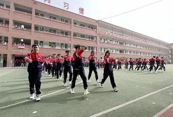 全體教師隊伍嚴整、腳步有力、動作標準,一回身、一擡腿、一伸手,每一個動作都與音樂融為一體,局面煞是壯觀。他們用舉動彰明顯什麽是典範,充沛展現出師生共奮進的傑出氛圍,彰顯了校園「陽光體育」運動效果。